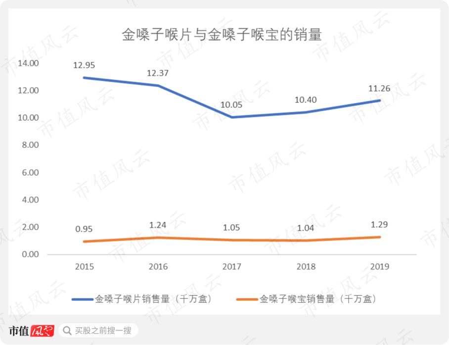 在2017年触底之后,喉片的销售量开始逐渐回升,在2019年达到1.13亿盒,不过这个销量仍然比2015、2016年的低。