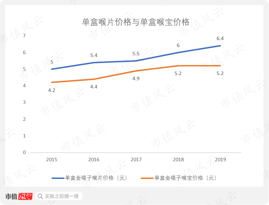 2015-2019年,金嗓子喉片和喉宝都在提价:前者从每盒5元增长到每盒6.4元,后者从每盒4.2元,增长至5.2元。