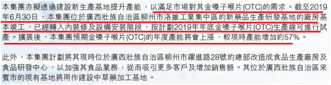 其中投入最大的是厂房。金嗓子在广西柳州市洛维工业集中区新建了一个药品生产基地,2019年上半年该工程基本竣工,并可于2019年年底进行投产,一旦全力开工可将金嗓子喉片的产能提升约57%。