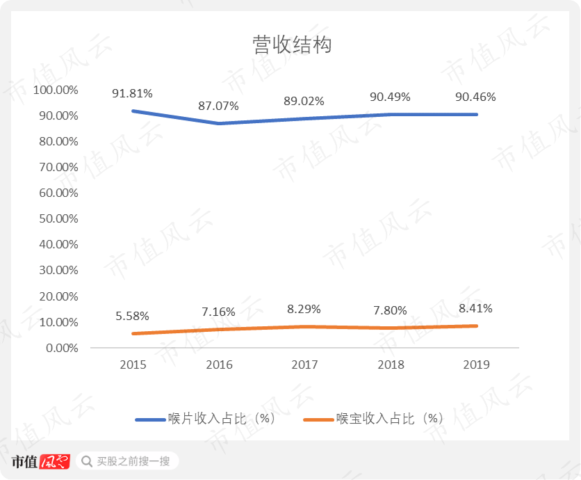 虽然金嗓子喉宝的收入占比从5.58%增长至8.41%,但比例依然很低。