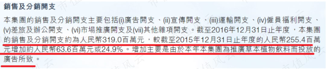 销售费用从2015年的2.55亿元,增长至2016年的 3.19亿元,增幅约为25%,主要原因是公司在2016年向市场推出了新产品:草本植物饮料。