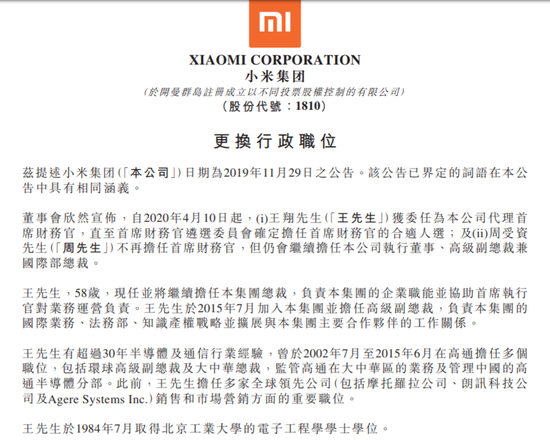 新浪港股讯 4月14日消息,昨日晚间,小米集团-W(01810)发布公告,自2020年4月10日起,王翔获委任为公司代理首席财务官,直至首席财务官遴选委员会确定担任首席财务官的合适人选;及周受资不再担任首席财务官,但仍会继续担任公司执行董事、高级副总裁兼国际部总裁。