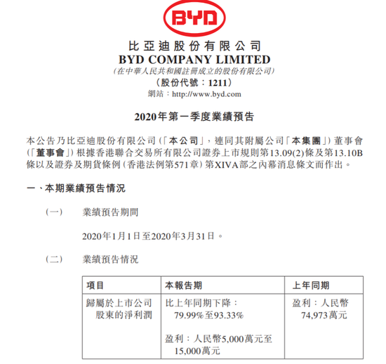 新浪港股讯 4月14日消息,13日晚间,比亚迪股份(01211)发布2020年第一季度业绩预告,于2020年1月1日至2020年3月31日,该集团归属于上市公司股东的净利润约人民币5000万元至1.5亿元,比上年同期下降79.99%至93.33%,上年同期盈利7.5亿元。