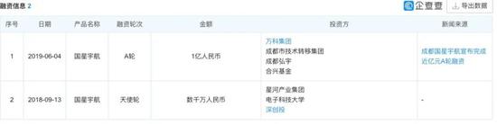2019年6月,由万科领投,由合兴基金、成都技术转移集团、成都弘宇等跟投,国星宇航完成1亿元的A轮融资。