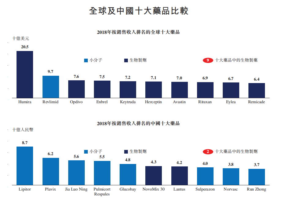 中国生物制剂市场近年的增长已超越全球生物制剂市场,此增长受一连串因素驱动,包括有利的监管环境及政府的支持性政策、生物疗法及定制疗法取得良好进展、生物制剂变得更易于负担及获取以及生物疗法的适应症范围更广。尽管近年来中国生物制剂市场急速增长,生物制剂在中国市场的渗透率仍然较低。在众多药品当中,生物制剂仍有巨大潜力,有望在未来中国占取更多市场份额。下图列示2018年全球及中国最畅销的十种药物。尽管全球最畅销的十种药物中有九种为生物制剂,惟中国最畅销的十种药物中仅有两种为生物制剂,显示中国生物制剂市场仍有巨大增长及扩展空间。