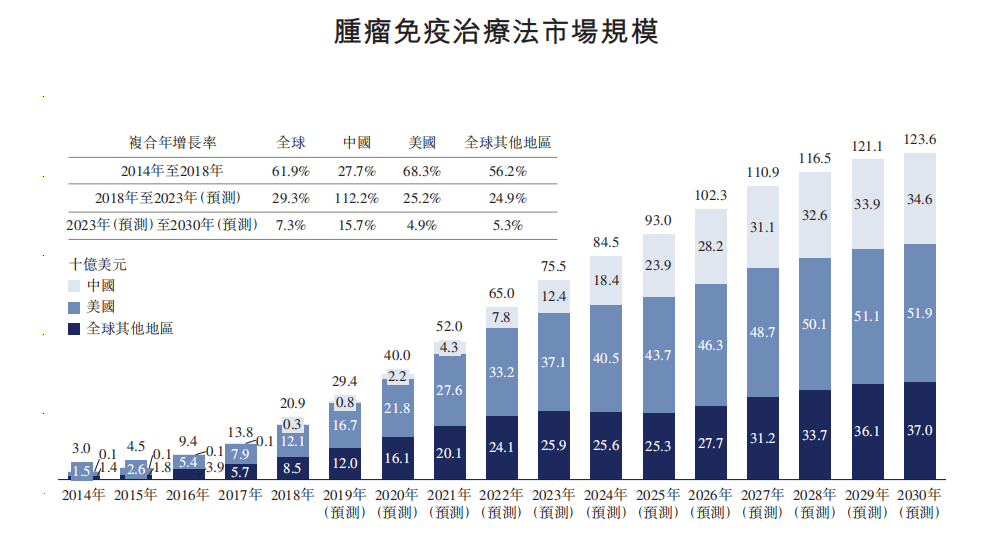 尽管不同的癌症病人群体存在差异,全球肿瘤免疫治疗法市场规模预计将继续在中国国内外大幅增长。
