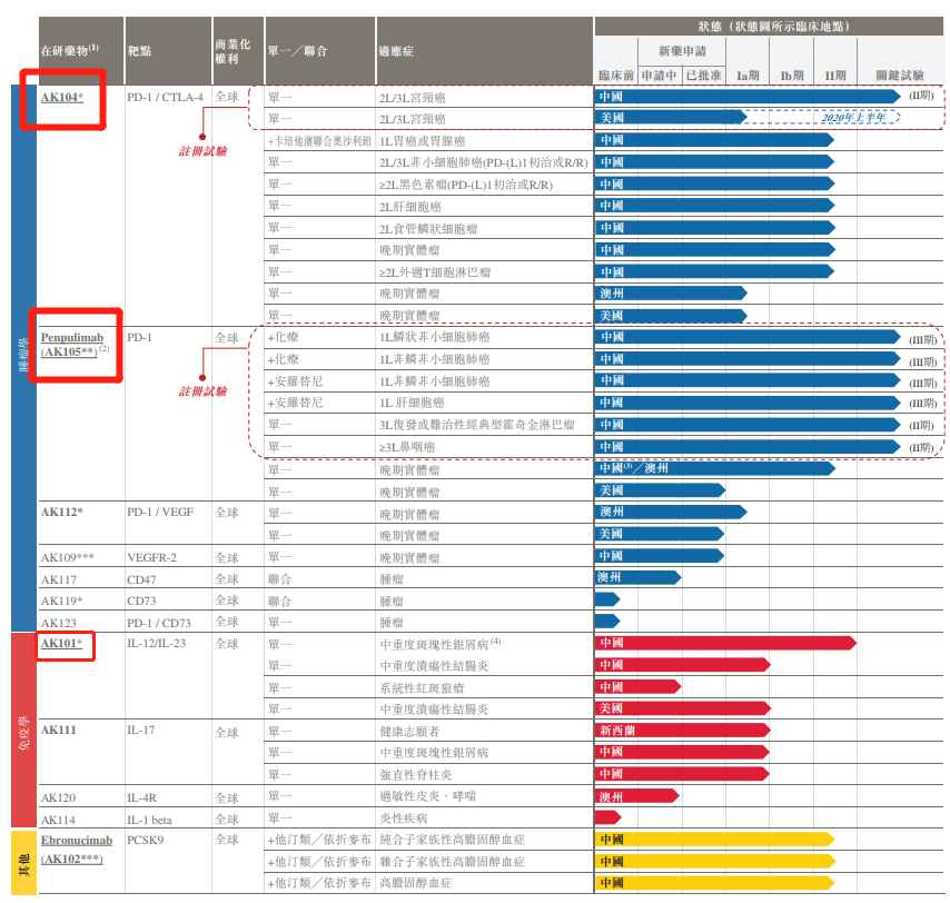 主要产品包括 PD-1/CTLA-4双特异性抗体(AK104)、PD-1抗体(penpulimab (AK105))和AK101。