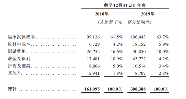 研发开支主要包括(i)候选药物的临床试验成本,包括就临床试验聘用合同研究组织、临床试验中心及其他服务提供商的第三方承包成本,(ii)购买候选药物研发所需原材料相关的成本,(iii)与临床前计划的测试费用相关的第三方承包成本,及(iv)研发活动有关的雇员薪金及相关福利开支。