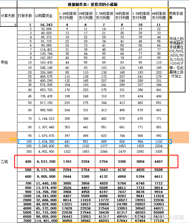 然后再来看看这一次,打新所需要支付的利息,这也是计算利息的天数是6天,下面表分别列出了在利率为1.6%,2%,2.5%,3%,3.5%,4%,这些情况下所需要支付利息的费用情况,因为这些都是不同券商可能出现的利率情况,小熊猫也都给大家列在表格里了,大家自行对比。