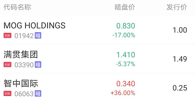 另外两只新股MOG HOLDINGS和满贯集团暗盘开盘后截至16:17分别跌17%和5.37%。