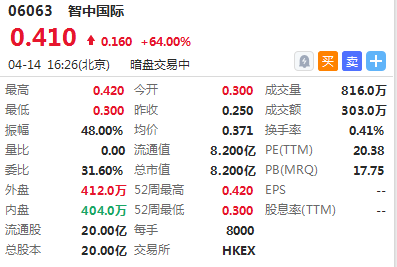 华盛资讯4月14日讯,今日下午有三只新股开启暗盘,其中智中国际高开20%,截至16:28涨幅64%,最新成交额303万港元,总市值为8.2亿港元。