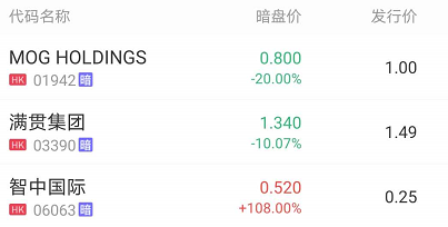 另外两只新股MOG HOLDINGS收跌20%,一手浮亏400港元;满贯集团收跌10.07%,一手浮亏300港元。