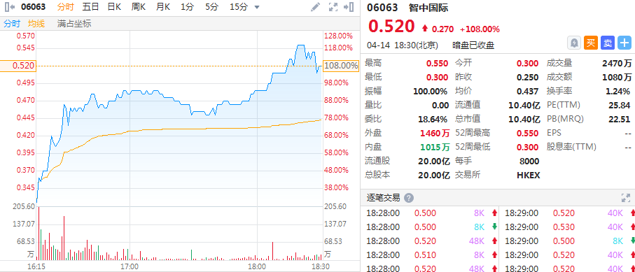 华盛资讯4月14日讯,智中国际暗盘收涨108.00%,不计手续费一手可赚2160港元,最新成交额1080万港元,总市值10.40亿港元。
