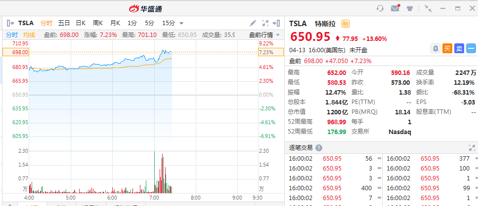 特斯拉美股盘前涨幅扩大至超7%,收复700美元关口。据特斯拉方面披露,特斯拉将于北美4月20日的电池会议日展示自研自产的新一代无钴电池,而市场普遍预计该电池将由超级电容器+干电极技术所组成,并且有望促使电池能量密度提升至300WH/kg,并发现通往500WH/kg的技术路径。