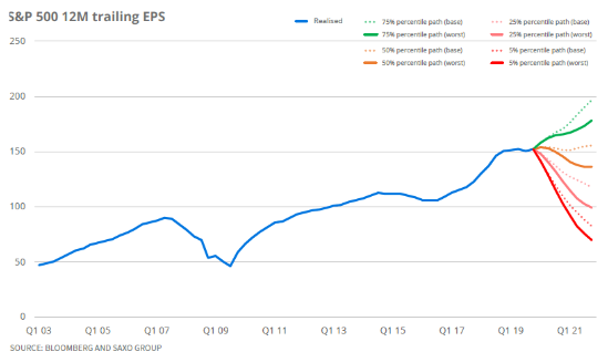 盛宝银行股票策略主管嘉恩利(Peter Garnry)在文中称,全球主要经济体的央行都已实现零利率,资产价格和投资者情绪会因为这些强力刺激政策得到提升,但随着各国经济数据逐一发布,投资者会意识到,其实要做的还有很多,未来股市依然面临下行压力,因为政策制定者向来都是姗姗来迟的。他预计新冠肺炎疫情原本的季节性影响会更加持久深远,预计未来12个月标普500指数每股收益将下滑28%,如果对应15倍收益率,股指可能会考验2000点。