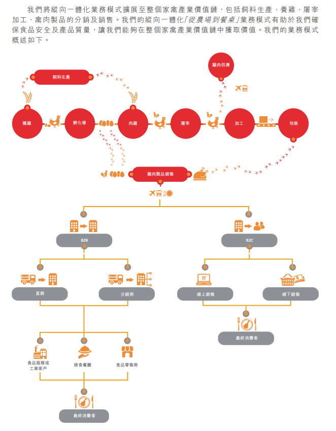 该公司家禽业务主要包括三个分部:鸡只养殖;屠宰加工及销售鸡肉制品、鸡苗及其他产品(包括部分非禽肉制品),现拥有22个种鸡场、三个孵化场、45个肉鸡场、8个屠宰加工厂、两个饲料加工厂及一个有机肥料。