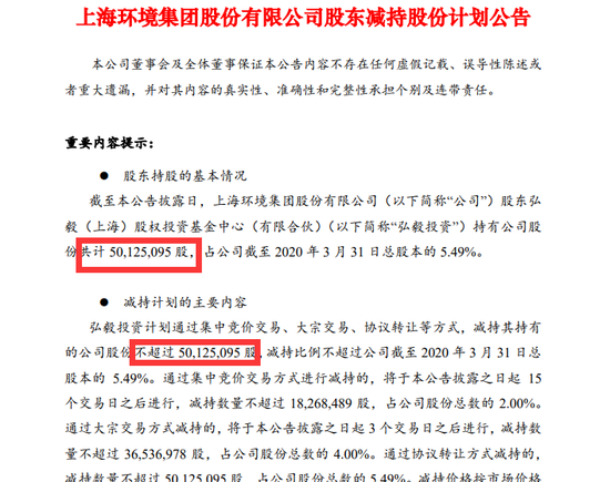 上海环境也公告称,持股5.49%的股东弘毅投资计划减持不超过5012.51万股,减持比例不超过公司总股本的5.49%。