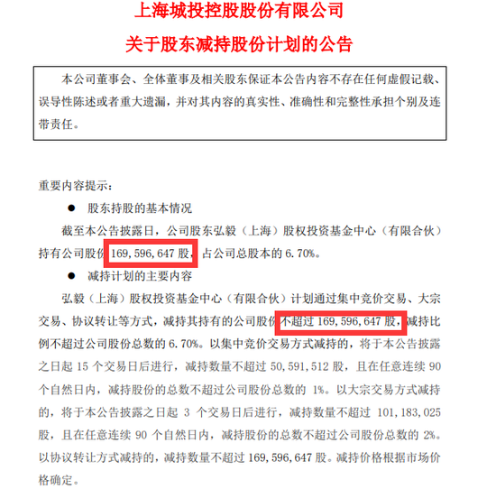 公告显示,股东弘毅(上海)股权投资基金中心(有限合伙)计划通过集中竞价交易、大宗交易、协议转让等方式,减持其持有的城投控股股份不超过1.69亿股,减持比例不超过公司股份总数的6.7%。