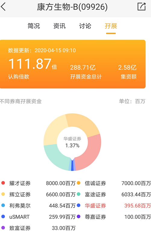 华盛资讯4月15日讯,康方生物-B认购第2天截至09:13,公开发售部分孖展倍数111.87倍,辉立、华盛等券商共计为其借出288.71亿港元,当前距离认购结束还有2天。