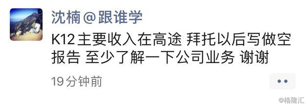 跟谁学CFO沈楠则回应称,“K12主要收入在高途,拜托以后写做空报告 至少了解一下公司业务 谢谢”。