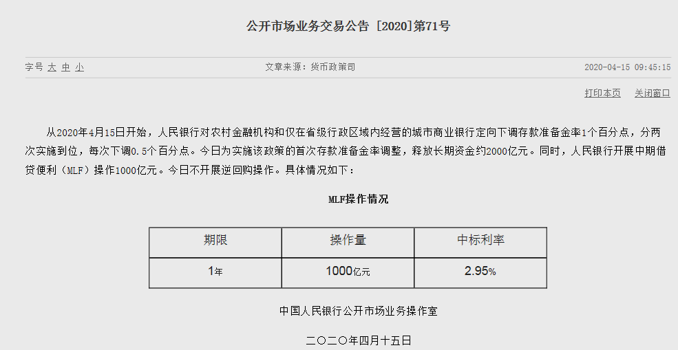 央行公告称,从2020年4月15日开始,人民银行对农村金融机构和仅在省级行政区域内经营的城市商业银行定向下调存款准备金率1个百分点,分两次实施到位,每次下调0.5个百分点。今日为实施该政策的首次存款准备金率调整,释放长期资金约2000亿元。同时,人民银行开展中期借贷便利(MLF)操作1000亿元。今日不开展逆回购操作。