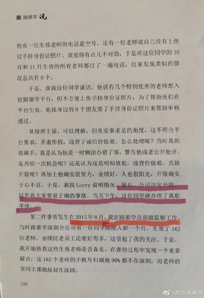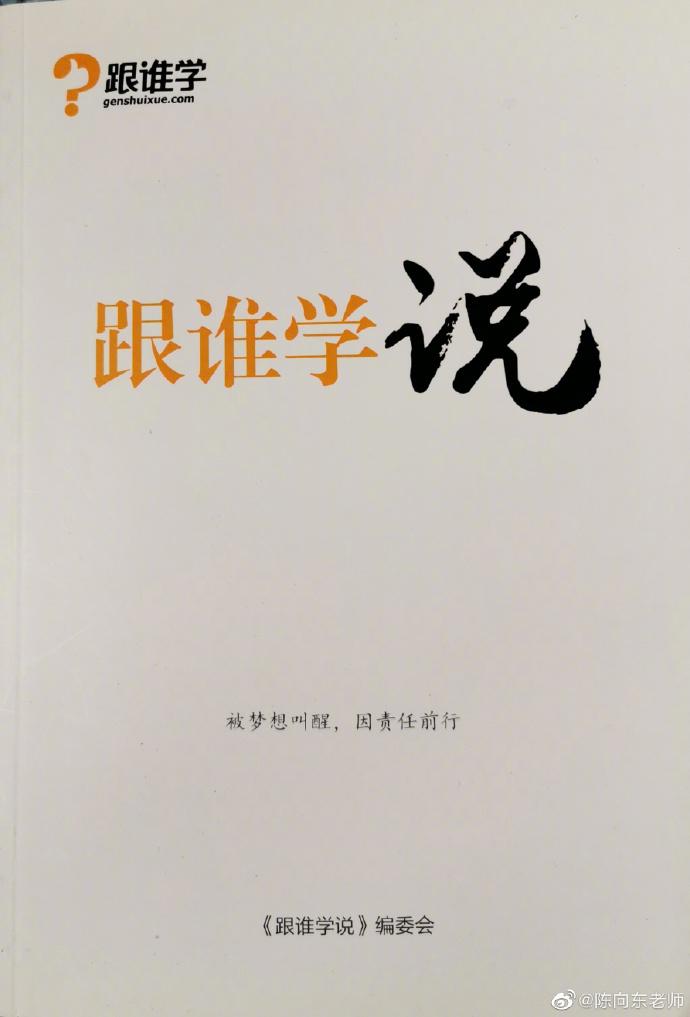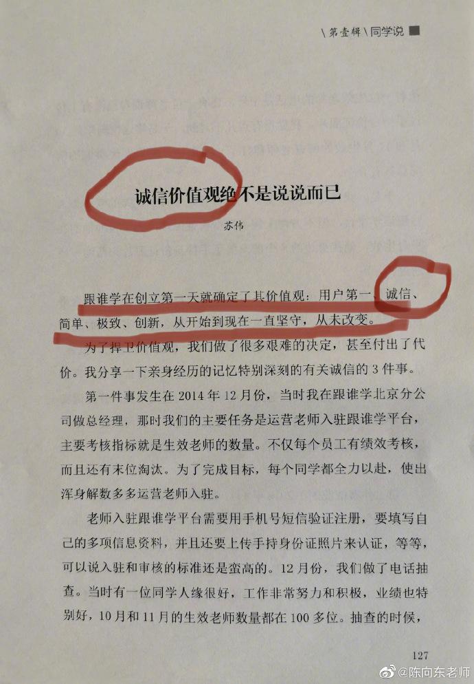 陈向东并晒出3张图片,图片中为《跟谁学说》一书,并标注了“诚信价值观绝不是说说而已”。(陈永乐)