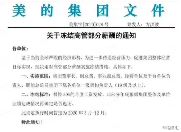 虽然,奥克斯、美的等还未公布一季度业绩,但丝毫不妨碍寒春袭来。网传”美的集团文件“显示,美的将冻结高管的部分薪酬,暂停30%的月度工资发放。美的回应称“属实”。到底发生了什么?