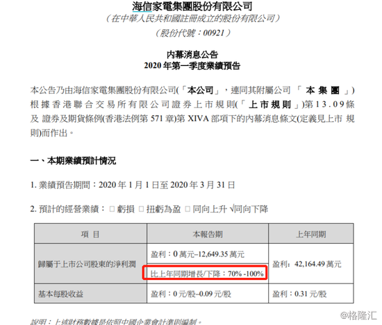 同样海信家电4月14日晚间发布2019年第一季度业绩预告,一季度预计净利润约0万元~1.26亿元,同比下降70.0%~100.0%。