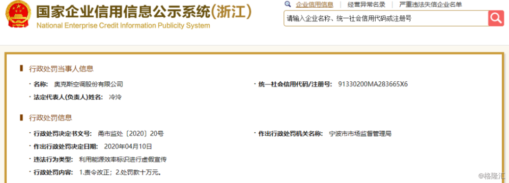 此前,格力电器实名举报奥克斯生产销售不合格空调产品。2019年8月28日,格力电器对实名举报奥克斯空调一事回应称,“我们对奥克斯的举报很有价值,要打破劣币驱逐良币的现状。”2020年4月10日,奥克斯空调股份有限公司利用能源效率标识进行虚假宣传,宁波市市场监督管理局对当事人奥克斯空调股份有限公司作出行政处罚决定:责令改正,并处罚款十万元。