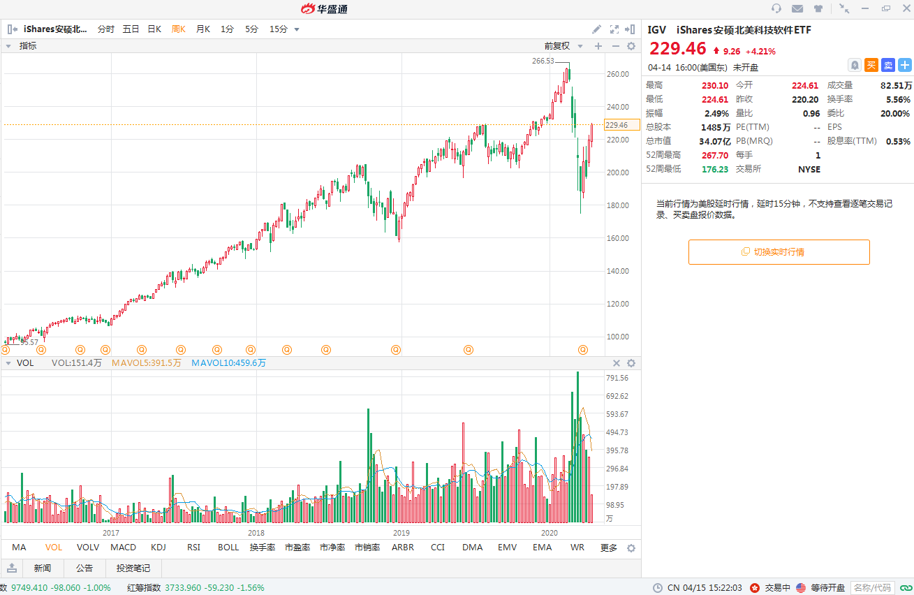 剔除2020疫情影响大市下跌,截止2019年底,过去5年,美股IGV ETF(北美软件服务)上涨189%。该ETF显著跑赢标普指数(67%)、纳斯达克指数(107%),为表现最好科技子版块之一,同时最近三年表现均跑赢同期标普指数。