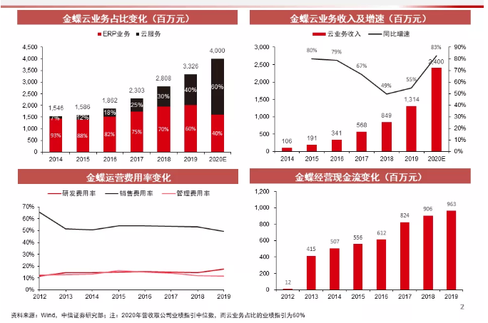 金蝶云转型初期依靠新增客户快速提升,2018年星空的客户数量为9500个,2015-2018年金蝶云星空客户增长速度为200%、150%、120%、70%;当用户增长速度趋稳后,云计算公司来未来增长动力来自ARPU值提升,公司于2018年8月重磅推出面向大型客户提供 PaaS+SaaS一体化的云平台金蝶云苍穹, ARPU值(每用户平均收入)超过百万,苍穹的推出将在ARPU这个维度复制Salesforce的大客户战略,随着苍穹ARPU值的提升将为金蝶云收入增长带来后续动力。