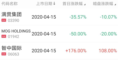 另外两只新股MOG HOLDINGS和满贯集团分别收跌50%和30%。