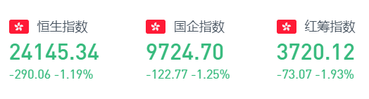 恒生指数周三小幅冲高后持续走低。截至收盘,恒生指数跌290.06点或1.19%,报24145.34点,全日成交额达1120.68亿。国企指数跌1.25%,报9724.7点,红筹指数跌1.93%,报3720.12点。