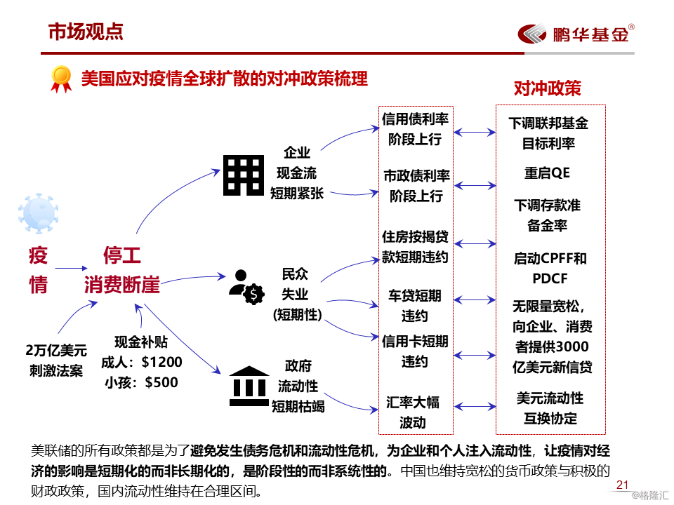 如果我们把美国所有的政策拆解开来,都是点对点。政策都是在对那些容易出现债务问题、债务危机问题、流动性问题的点去做支撑,让经济即使按下了暂停键,但是这些毛细血管——民众和企业代表的经济活力不会冻死,不让这个市场出现系统性的债务违约,一直撑到疫情过去。