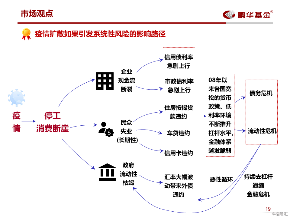 所以如果没有政策进行强干预,疫情本身会带来各个经济主体的债务出现问题,债务危机会逐渐传导成为流动性危机,进而演变成经济的衰退。