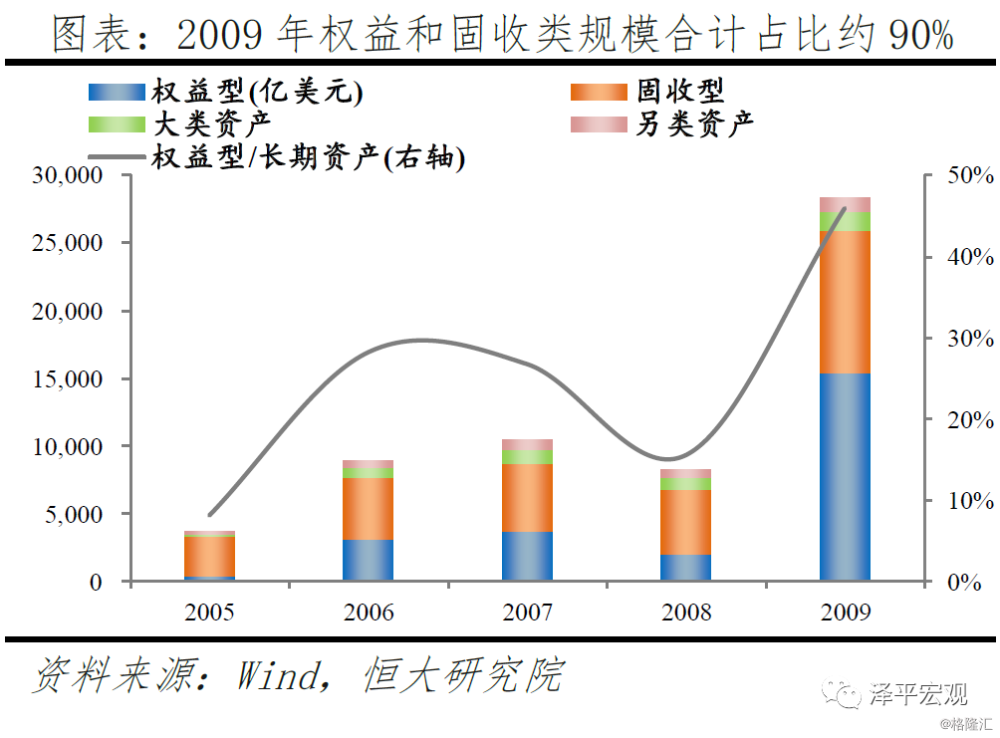 美国养老金体系改革、婴儿潮一代人退休等推动养老金入市规模增加,形成“养老金入市-股权融资改善-企业盈利向好-股市增长-养老金规模增加” 的螺旋上升过程。1)养老金体系改革, 1974 年,《雇员退休收入保障法案》中推出IRAs,允许个人将部分应税收入存入IRA个人账户,到期后取款才需缴纳个人所得税;1978年《国内税收法》新增第401 条K项条款,规定缴费确定型养老金享有税收递延优惠,此后401(k)计划与IRAs为代表的养老金成为美国共同基金的重要资金来源。2009-2018年养老金市场资产规模由16.1万亿美元增至27.1万亿美元。2)婴儿潮一代人退休需求驱动养老金规模增长。90年代后,缴费确定型退休计划进一步普及,叠加婴儿潮时期出生的人开始为退休做准备,养老金市场规模迅速膨胀。这一阶段相对稳健的基本面叠加持续低利率环境促使养老金不断提升权益资产配置,一方面满足企业直接融资发展需求、改善企业盈利,另一方面长期资金降低了市场波动,进一步推动股市向上。1980年至2000年,美国私人部门缴费确定型养老金计划约有40%投资于股票资产,同期标普500从100点上涨到1500 点。2018年末,IRA和缴费确定型计划投资于共同基金市场规模达8.2万亿美元,占共同基金总规模的46.3%。