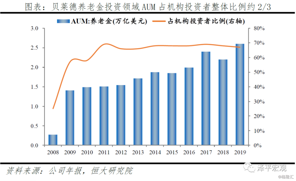 贝莱德瞄准机构客户,深耕于养老金领域。贝莱德的客户包括1)机构投资占六成。主要为养老金、捐赠基金、信托基金、官方机构和财务机构等,机构投资者占比递减,但仍占主导。2)零售客户占一成,主要包括高净值人群和零售机构,2019年占比10%。3)iShares占三成,作为独立的交易平台,为机构客户、零售客户提供全球范围的交易,2009-2019年iShares ETF占比由15%大幅提升至33%。贝莱德机构投资者中67%为养老金机构。2019年末养老金AUM进一步增至2.6万亿美元,占管理机构投资者资产规模的67%。早在成立初期,贝莱德已处于养老金市场规模迅速扩张阶段,为扩大在养老金市场影响力,旗下LifePath产品自1993年起深耕养老金投资策略,争取尽可能多的客户资源。2009年收购iShares同时也并入其养老金业务,当年贝莱德养老金规模由0.27万亿美元增至1.46万亿美元,贝莱德成为全球最大的养老金管理人。