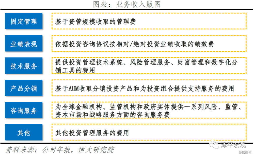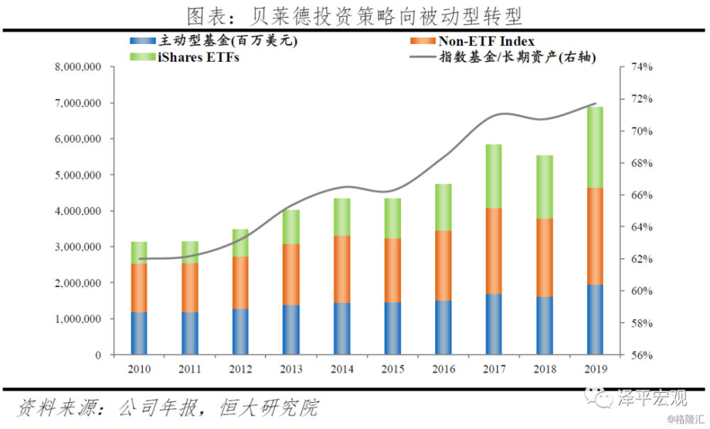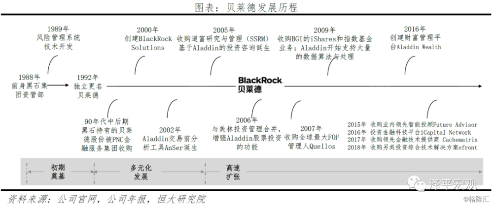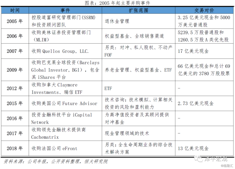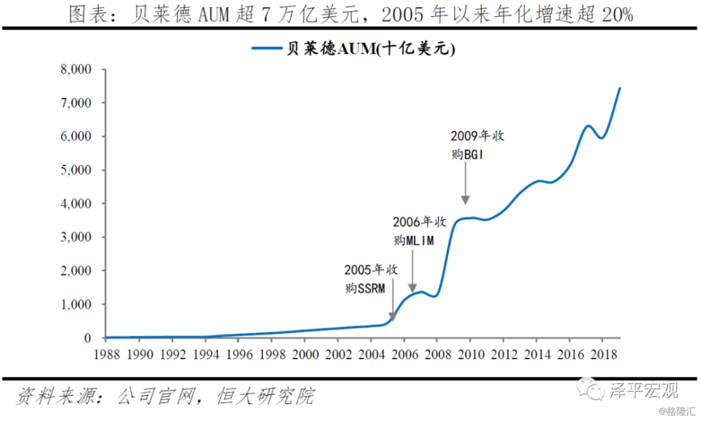 3)外延并购 (2005至今):乘被动投资东风,逆势扩张。这一时期美国主动型基金收益快速下滑,低成本的被动投资兴起,贝莱德借助ETF东风,一是通过一系列资本运作逆势扩张,2005年收购道富研究与管理(SSRM),实现从固收类产品拓展到权益类产品;2006年与美林资管(MLIM)合并,引入大量机构投资者,资产规模翻倍;2009年斥资135亿收购巴克莱全球投资者公司(BGI),获得旗下全球最大的ETF交易平台iShares,从主动管理转移到被动投资,资产规模从1.3万亿跃至3万亿美元,成为全球第一大资产管理公司。二是转危为机,将阿拉丁系统推向全球,2008年次贷危机使众多大型金融机构深陷破产之际,贝莱德不但免受波及,而且还成为美国政府清理有毒资产的专家顾问,名声大振。三是修炼内功,引领行业变革。资管规模已经位居世界第一的贝莱德并没有停止创新步伐,2011年向卖方业务延伸,如成立小型资本市场、启动内部交易平台以降低对经纪商依赖、启用人工智能、积极在ESG领域开展投资等。2005年-2019年,贝莱德管规模从4530亿美元增长至74296亿美元,年化增速达22%。