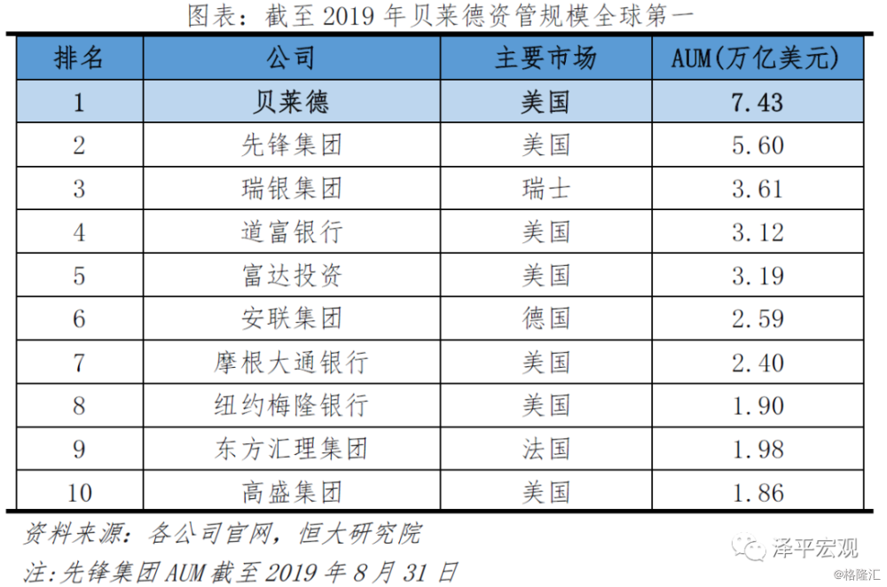 发展至今,贝莱德稳居全球最大资产管理公司宝座,2019年末AUM达7.43万亿美元,这一资金体量约占中国GDP的一半,遥遥领先于第二名先锋5.6万亿美元AUM。