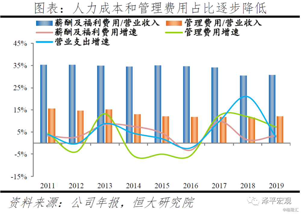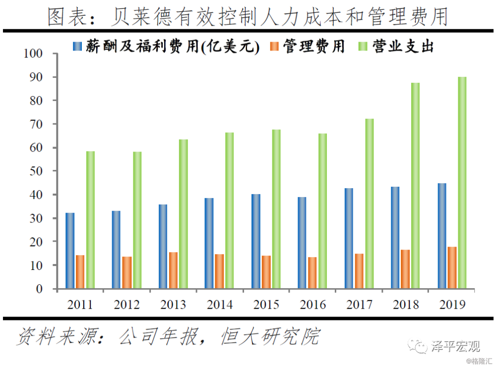 四是降低运营成本。量化投资策略以及AI智能投资技术的应用导致人工被替代,自2013年以来,贝莱德经历三轮大规模的裁员,最新是2019年1季度宣布裁员约500人,占总员工数的3%,其中约有40名主动型基金部门员工被裁,包含7名投资组合经理。2013年以来,贝莱德营业支出处于平稳波动,2018年以来支出显著上升的原因是新收入确认规则引起服务及分派支出的增加。而薪酬及福利费用、管理费用规模稳定,增速处于下行趋势,二者占营业收入的比例持续缩小。