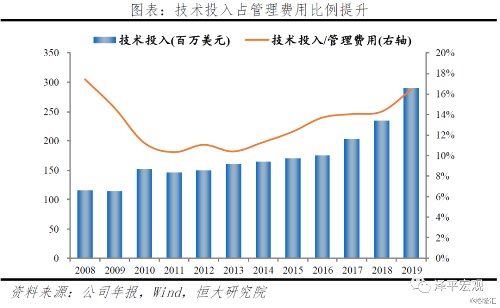 三是创造收入增长点,护城河作用显现。阿拉丁在服务贝莱德自身业务外,也不断向其他资管公司、财富管理公司等输出科技,并进入科技投资收割期。阿拉丁系统风险分析服务于包括银行、退休金、保险公司、主权投资者以及捐赠基金等机构,服务对象在全球已超过500家公司、55000名投资专业人员,参与管理的投资组合超过80万个。2006年-2019年技术服务创收年均复合增长15.6%,2019年技术服务收入9.74亿美元,同比增长24.1%,远高于2.4%增长的营业收入,是增长最快的收入部门之一。当前技术服务收入占比虽不足10%,但根据企业规划,未来占比将达到30%。