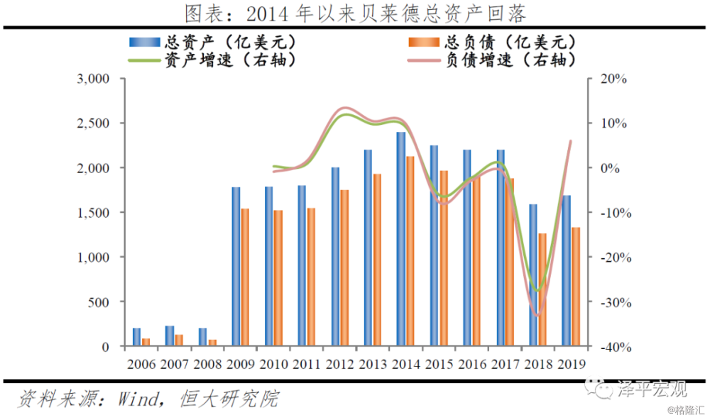 1)资产收缩,资产负债率低。贝莱德属轻资产运营,2019年总资产仅1686亿美元,相比于我们此前研究的金融巨头高盛(总资产9449亿美元)、伯克希尔(总资产7078亿美元)、瑞银(总资产9721亿美元),资产规模相形见绌。2009年贝莱德资产规模大幅提升主因是收购BGI;近年资产规模下滑,主要是贝莱德人寿业绩下滑引起资产缩水。2019年账面资产负债率为79%,但大量资产和负债为独立账户的养老金持有资产和保险抵押品,如果剔除这部分不属于贝莱德支配的资产和负债,真实资产负债率仅30%。