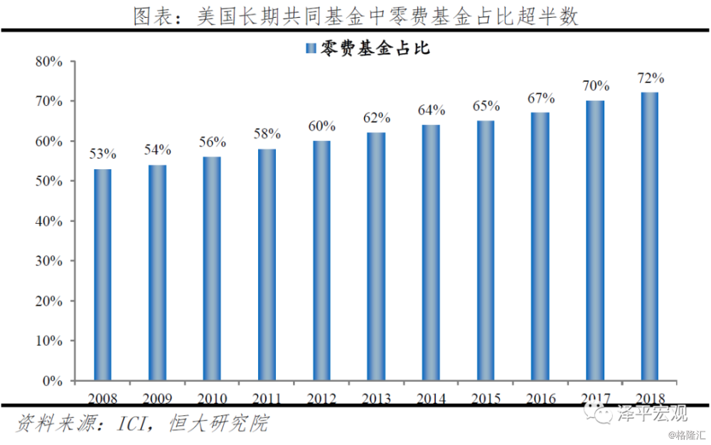 80年代起,美国共同基金行业收费体系逐渐成熟,专业的独立投资顾问出现,经历过两次收费模式转变。1)由一次性申赎费向持续性收费转变,70 年代基金收费普遍采用申购费、赎回费方式,在基金持有人购买和赎回时一次性收取,导致频繁申赎。为了鼓励长期持有、降低持有成本,1980年SEC制定12b-1规则,从基金净资产中扣除支付顾问和销售的费用,12b-1要求该费用不得超过基金净资产的1%,其中分销和营销部分每年不超过 0.75%,服务费用部分最高不超过 0.25%。但该种收费模式也因不透明而饱受诟病。2)由卖方佣金制转向买方咨询服务费用,传统的分销渠道模式需要支付给渠道商高额的尾随佣金,成本居高难下,指数基金的出现加剧市场竞争,各机构不断下调费率,将12b-1费用降至0%,零费基金占比逐渐提高,行业由卖方佣金向买方咨询服务费变革,压缩销售渠道成本,倒逼基金公司聚焦产品和投研服务。