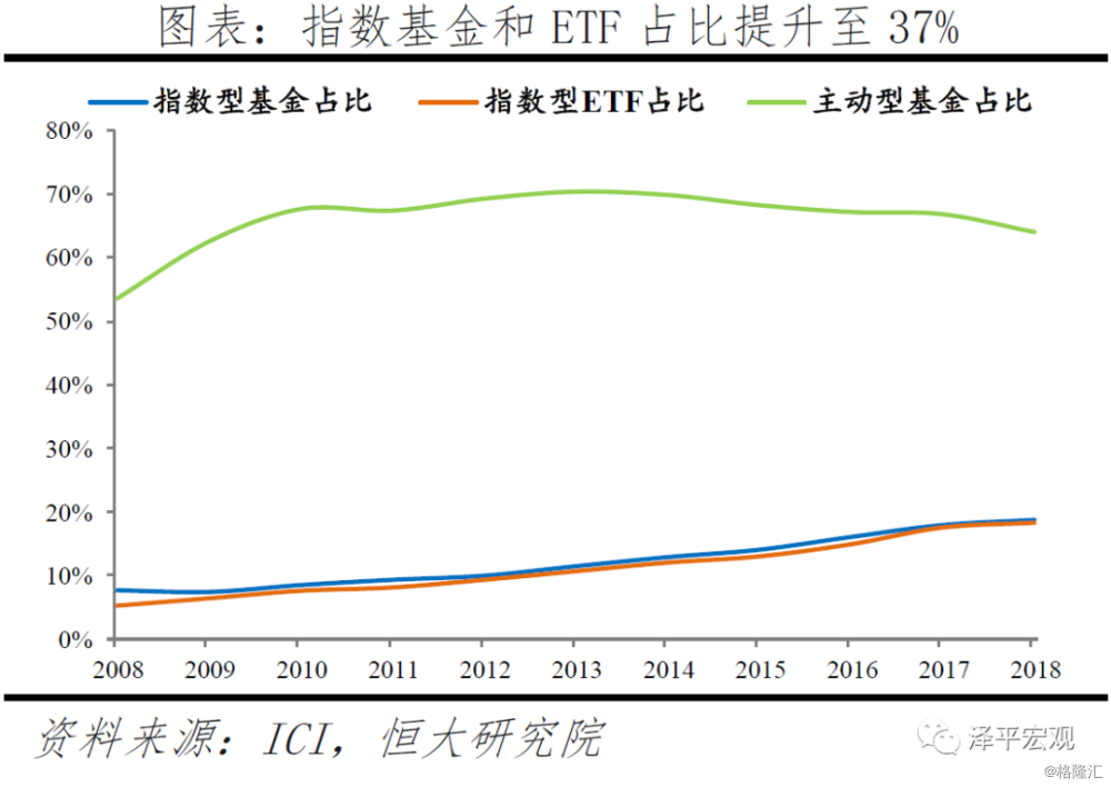 美国被动投资的发展得益于市场条件和金融创新。1)美股长牛。量化宽松政策向市场注入廉价流动性,催生美股长牛,呈现低波动上涨趋势,吸引大量被动投资者力图复制市场走势,获取市场平均收益。2)资本市场有效性提升。经过多年市场博弈,当时的美国股市越来越有效,获取超额收益的难度加大,而被动投资成本低廉,相对回报更高,1994-1996年91%的股票基金的收益增长率低于标准普尔500指数增长率。股神巴菲特曾指责基金经理收费太高,吞噬了投资者的收益,并建议普通投资者投资指数。3)ETF金融创新极大便利被动投资。ETF被设计为买卖一篮子股票,最初是为缓解股市崩盘时流动性不足问题,但其透明度、流动性、风险分散等特征迎合被动投资理念,1999-2018年ETF规模从340亿美增长到3.3万亿美元。