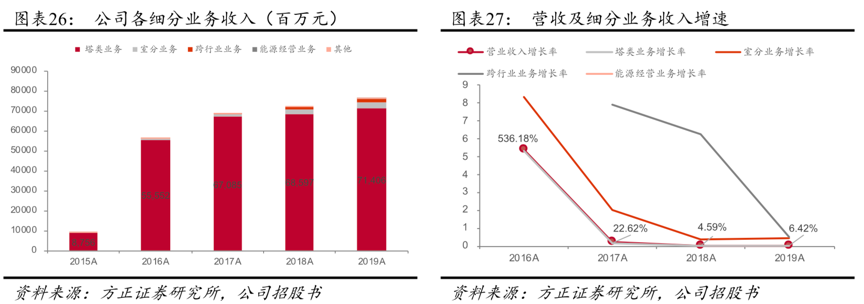 从分部业务来看,塔类业务仍然是营收核心,塔类业务的增速与总营收增速高度重合。除塔类业务外,中国铁塔的室分业务、跨行业业务、能源经营业务和其他业务的占总营收比从2015年的0.5%提升到2019年的6.57%。整体看,铁塔多元化经营成效显著,但仍以塔类业务为核心。