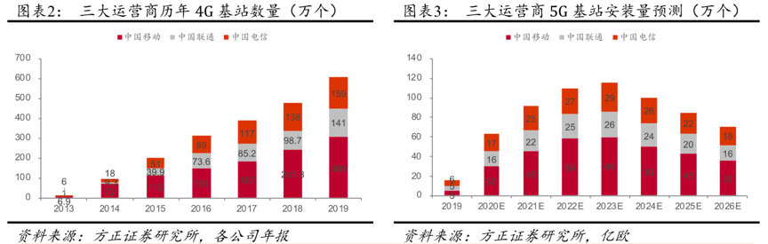 基于此,中国未来的5G基站数量或将继续高速增长。根据方正证券预测,2020-2023年间,每年新增安装量会稳步增长,并在2023年达到顶峰。预计最终在2026年,中国铁塔5G基站将达到648万个。
