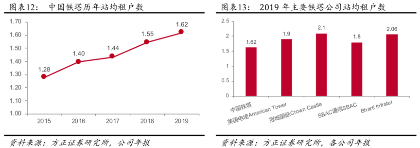 由于5G对基站数量和覆盖密度要求较4G更高,铁塔的共享率也会有所提升,中国铁塔站均租户数有望继续抬升,在边际成本有限的情形下进一步提升公司的毛利率。此外,对比全球范围内的铁塔同行,中国铁塔站均租户数(1.62)仍有进一步提升的潜力,在5G时代或将进一步释放利润。