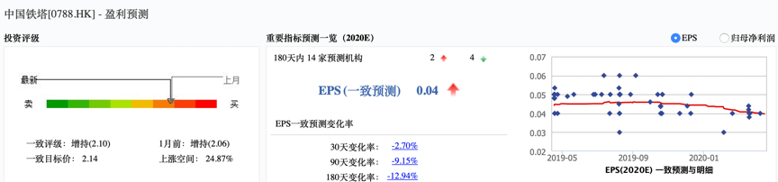 此外,Wind数据给出的机构一致目标价(2.14港元)也与方正证券基本相当,较当前仍有近25%的上涨空间。投资者或可关注即将公布的一季报,并对中国铁塔的后续发展进行判断。