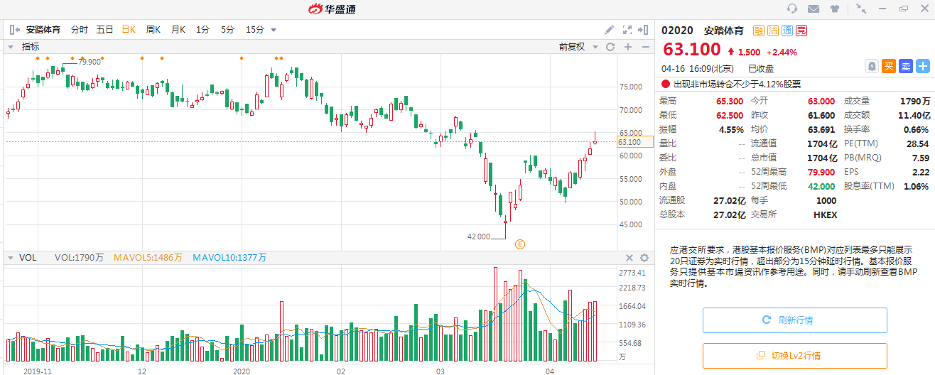 根据国信证券预期,安踏2020年至2022年净利润有可能同比增长6.0%/35.1%/17.3%,对应PE为26.4x/19.6x/16.4x。 截止4月16日收市,安踏股价涨至63.1港元,滚动市盈率已达28.5,超出了机构对其2020年的估值水平。