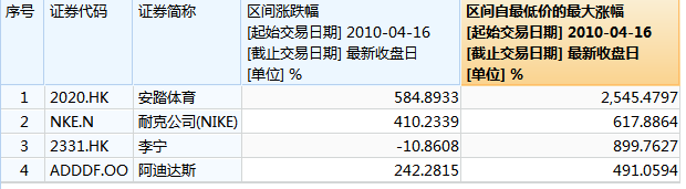 根据wind数据统计,从2010年4月16日至今,耐克公司的最大涨幅为617%。而阿迪达斯的区间最大涨幅为491%,另一个著名国产运动品牌李宁的区间最大涨幅为899.8%。从行业来看,安踏股价过去十年最牛的称号当之无愧。